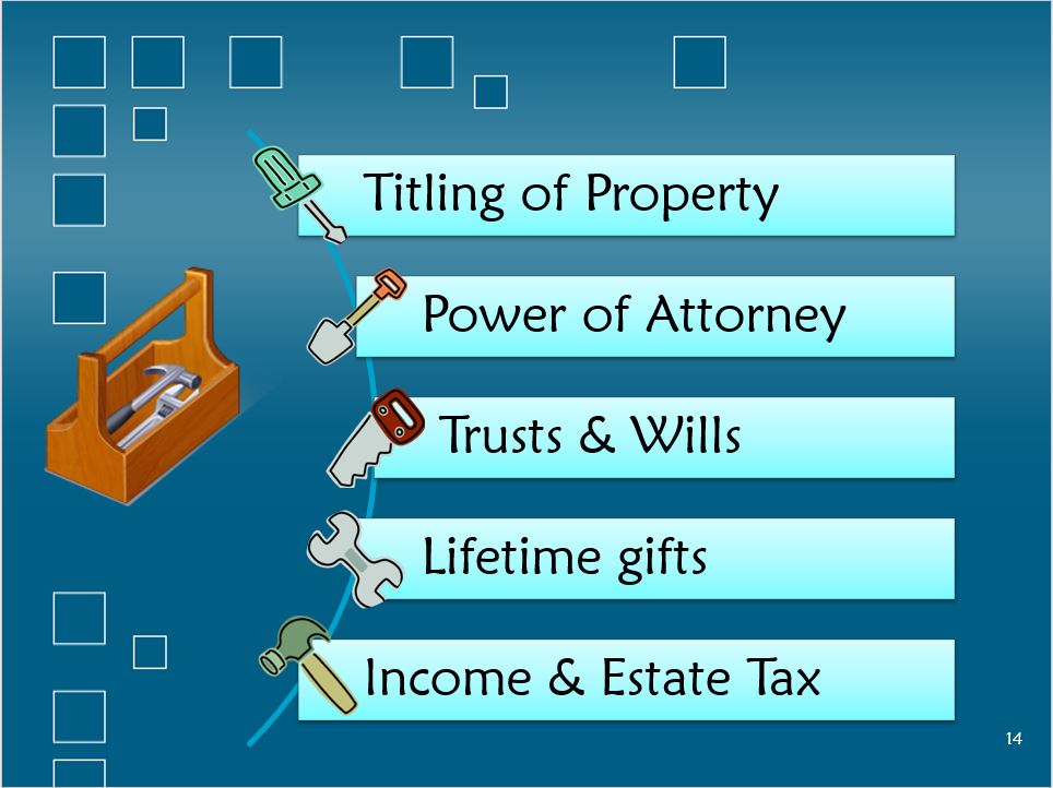 Knowing your tools and learning how to use them makes any job easier. The same is true for estate planning. In this workshop, you’ll become familiar with a range of estate planning tools, what they do, and the terminology they use. In addition to wills, trusts, and powers of attorney, we will discuss the role that insurance, titling of property, and gifting can play. Finally, we’ll take a look at how these tools work with our tax system, including estate, income, generation-skipping and gift taxes.